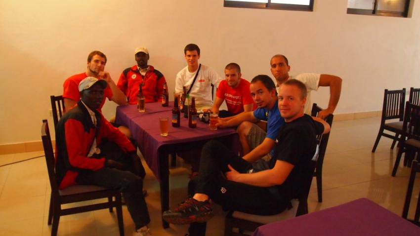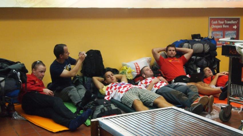S obzirom na relativno kasno slijetanje, skromna zračna luka Jomo Kenyatta pruža nam utočište u noći koja slijedi. Pripremivši postelje podno pulta zatvorene aerodromske mjenjačnice, primjećujemo kako smo na tom dijelu aerodroma zapravo sami, uz nekoliko gotovo doslovno nevidljivih čistaća podova u kožnim cipelama i a la Metal Opatija tamnoplavim radnim tutama. To nas vuče da vrijeme ubijemo nekim barem donekle sportskim aktivnostima pa se dijelimo u dvije ekipe po dva igrača (Zoranu i Siniši u tom je trenutku bilo zabavnije spavati) za svojevrsno ekspedicijsko sportsko natjecanje. Vitomir i Ivan pobjeđuju nas u nekoj novoj košarci, dok im Nebojša i ja bez većih problema uzvraćamo pobjedom u aeronogometu s kolicima za prtljagu kao golovima. Prekrivanje natpolovične površine ekspedicijskih majica znojem označuje i kraj ljetnih sportskih igara, no da ne bismo došli na kraj i s bezmalarijskim periodom života, sušimo se, presvlačimo,  špricamo i mažemo najrazličitijim protukomaričnim sredstvima.
